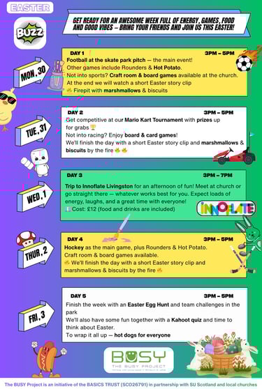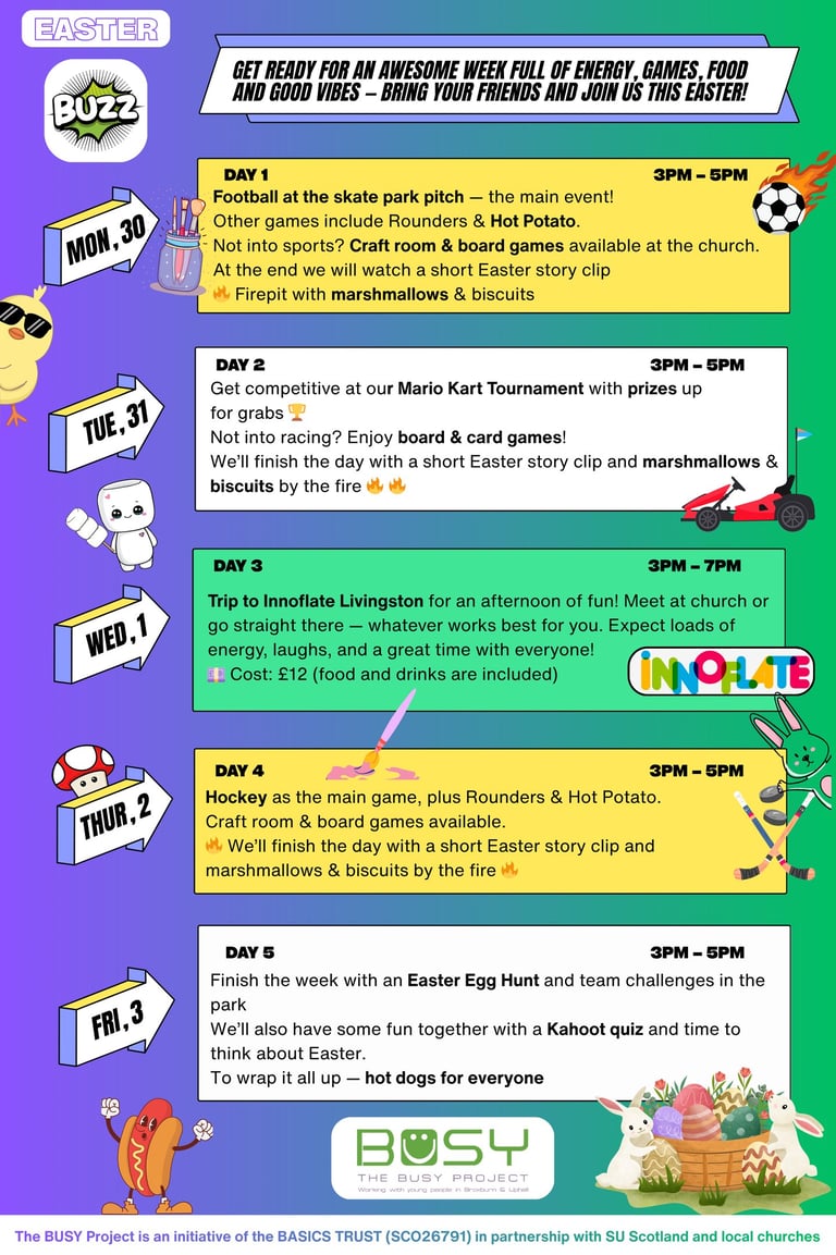 From Monday, 30th March to Friday, 3rd April, we’re taking over Uphall South Church (and heading to Innoflate Livingston!) for a week you won’t want to miss.